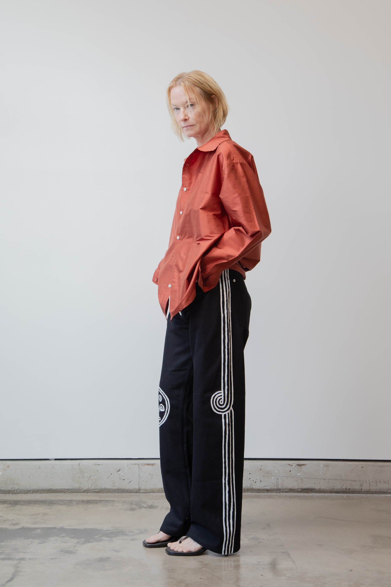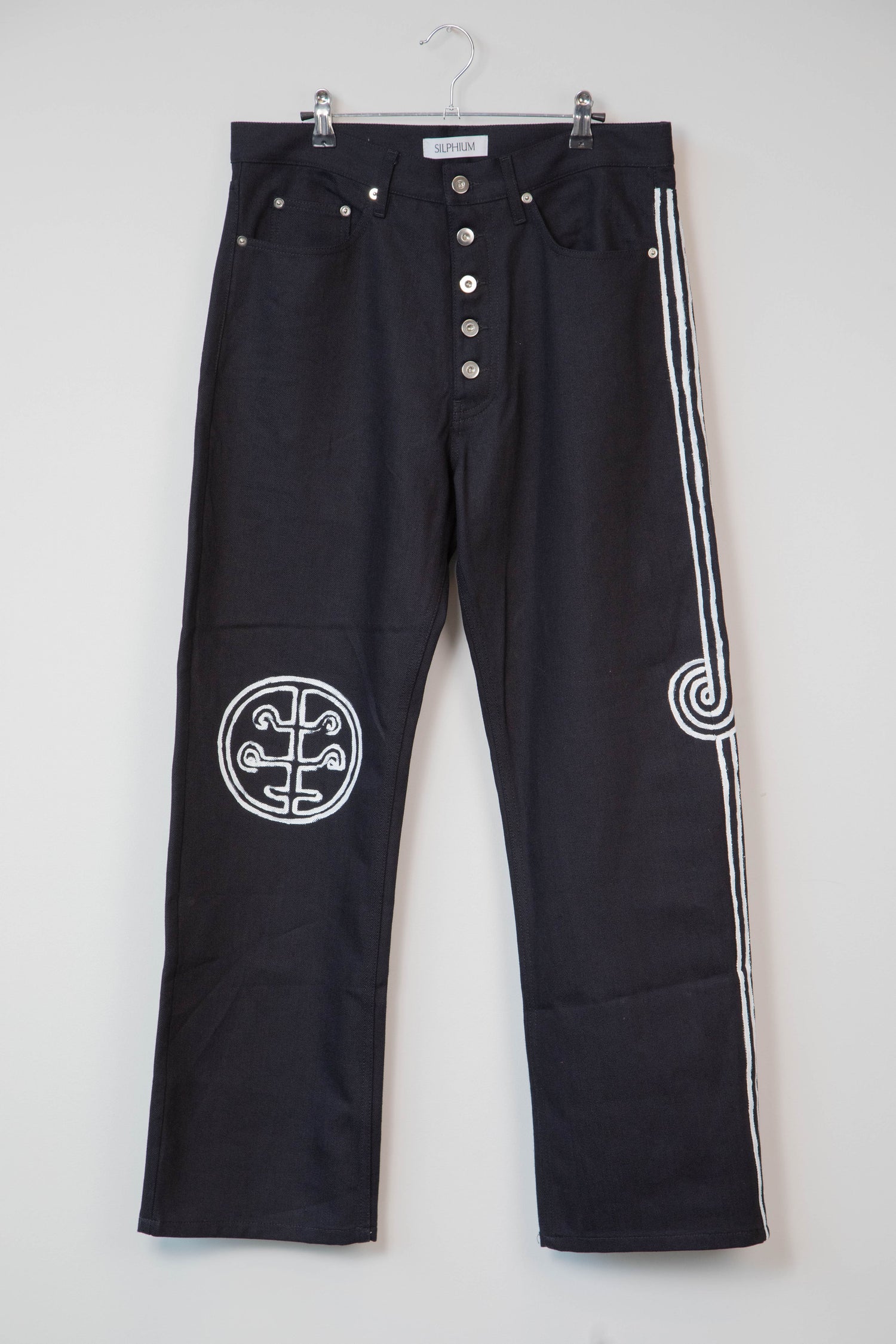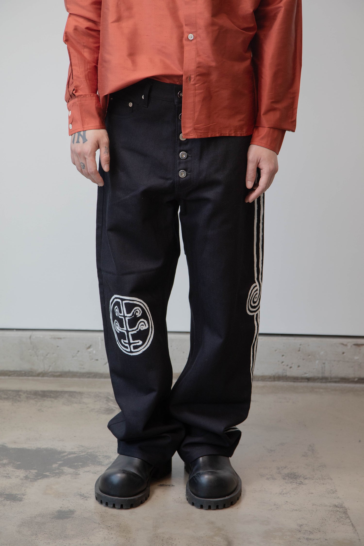 SILPHIUM'S STAPLE CORE DENIM, IN USA MILLED COTTON DENIM, IS SEEN HERE HAND-PAINTED IN A.M.S SIGNATURE STYLE.