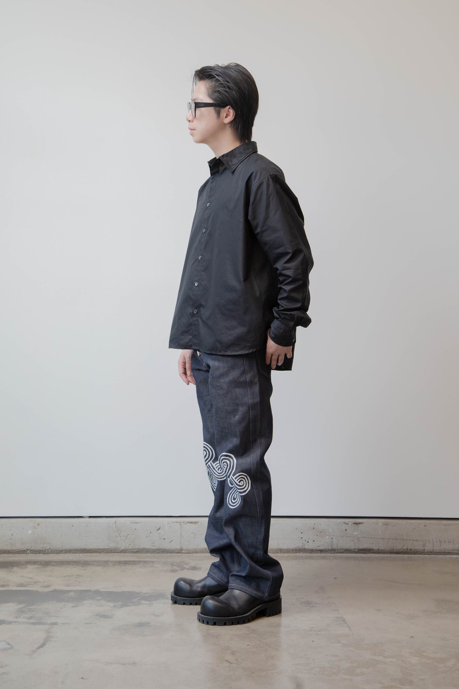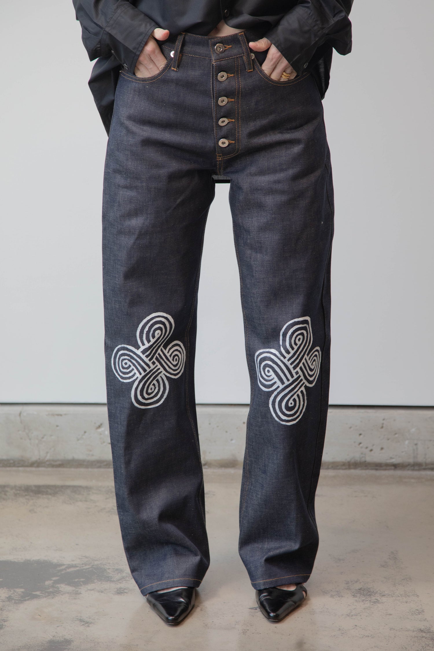 SILPHIUM'S STAPLE CORE DENIM, IN A JAPANESE INDIGO RAW DENIM, IS SEEN HERE HAND-PAINTED IN A.M.S SIGNATURE STYLE.