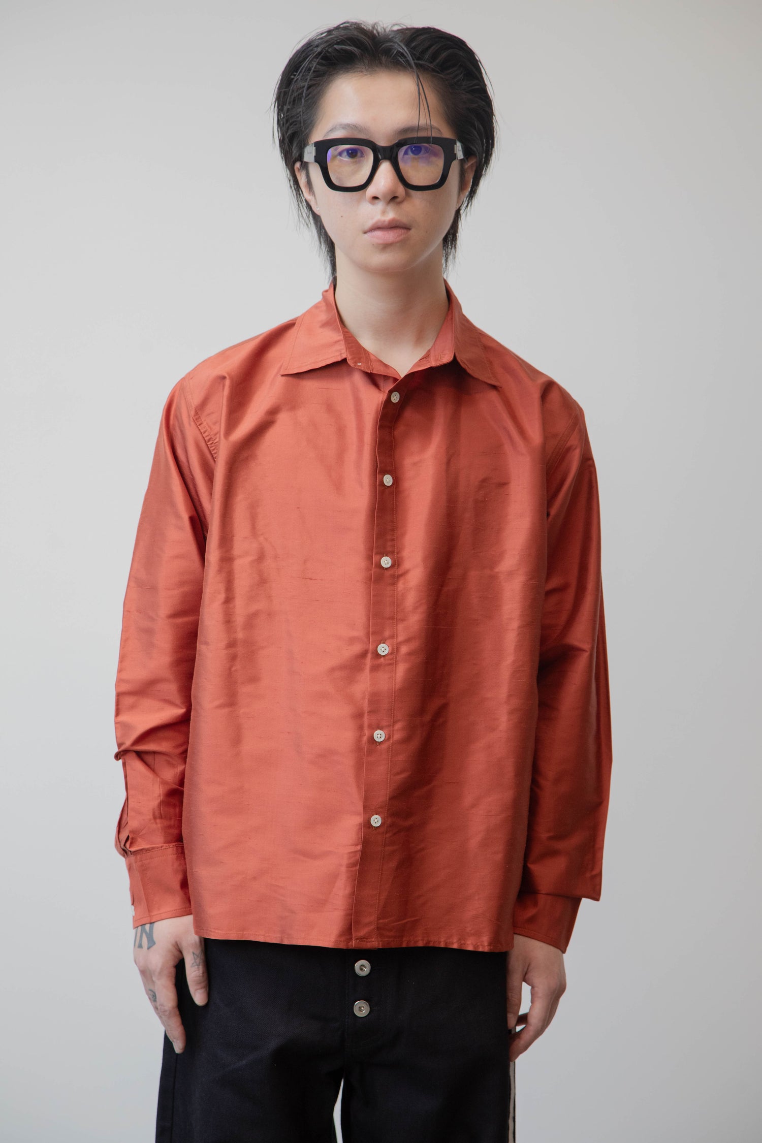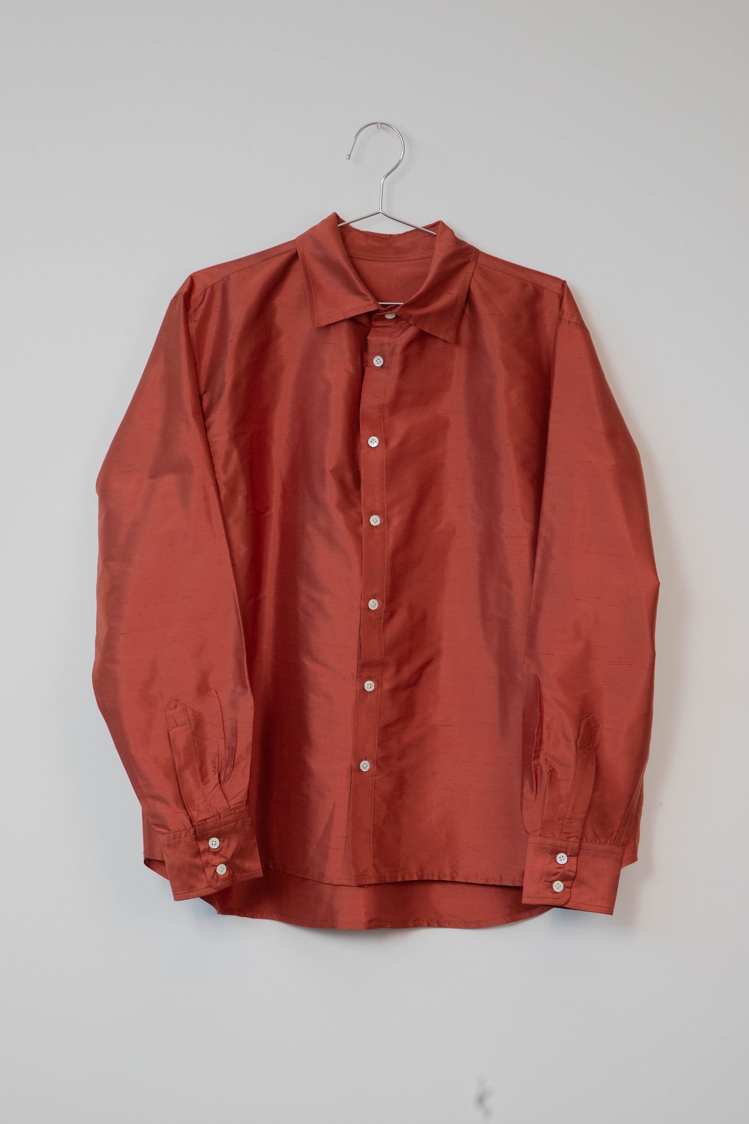 SILPHIUM'S BECK SHIRT, NOW FEATURED IN A TERACOTA SILK DUPIONI, WAS THOUGHTFULLY PRODUCED HERE IN NEW YORK AND INCLUDES A HAND-PAINTED TAG BY ANDREA M SMITH.