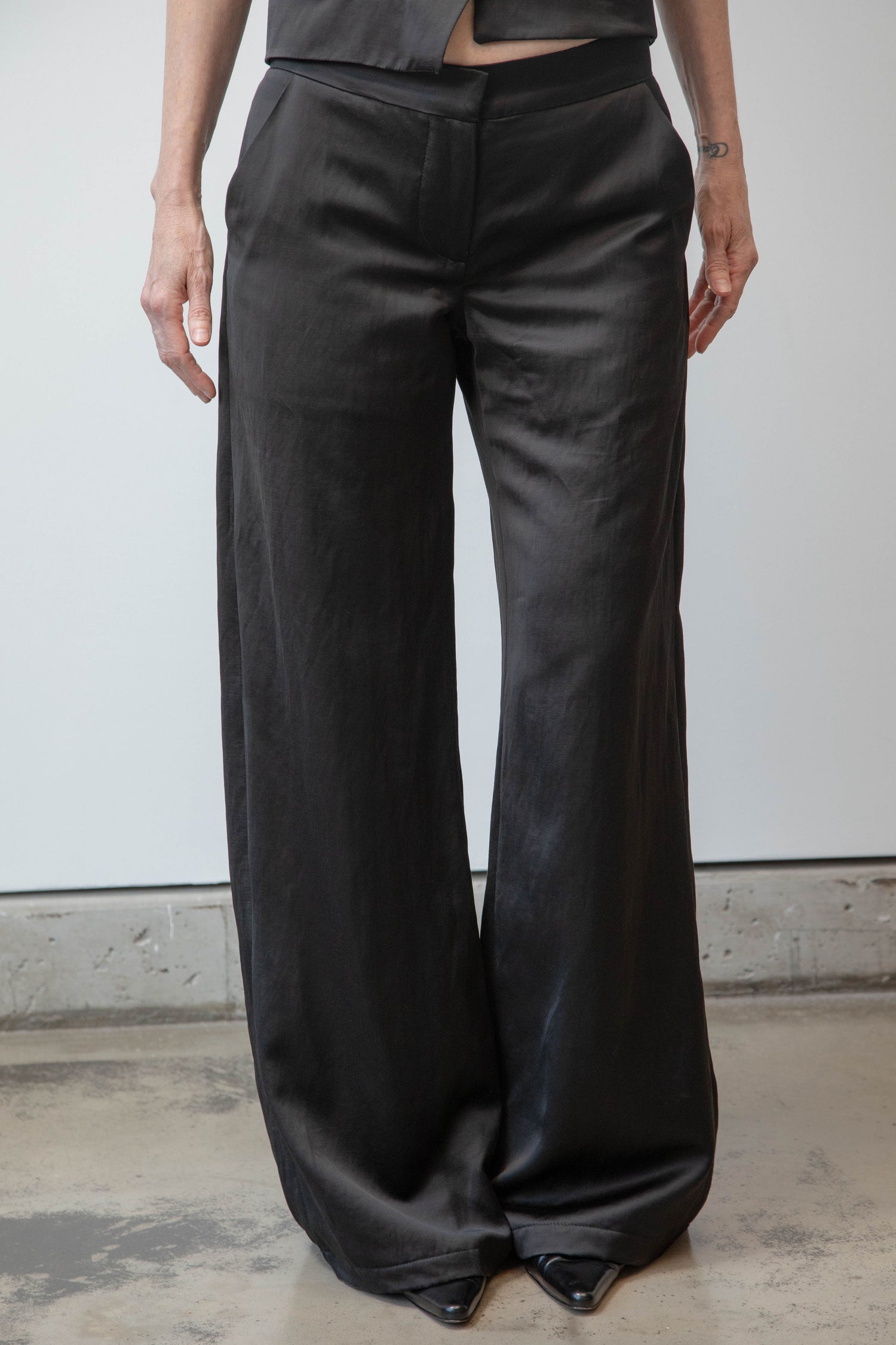THE GALA TROUSER IS OUR NEWEST PANT SILHOUETTE FEATURING A ZIPPER FLY, HOOK & EYE CLOSURE, BACK RIGHT WELT POCKET AND DRAPEY, WIDE LEG FIT.