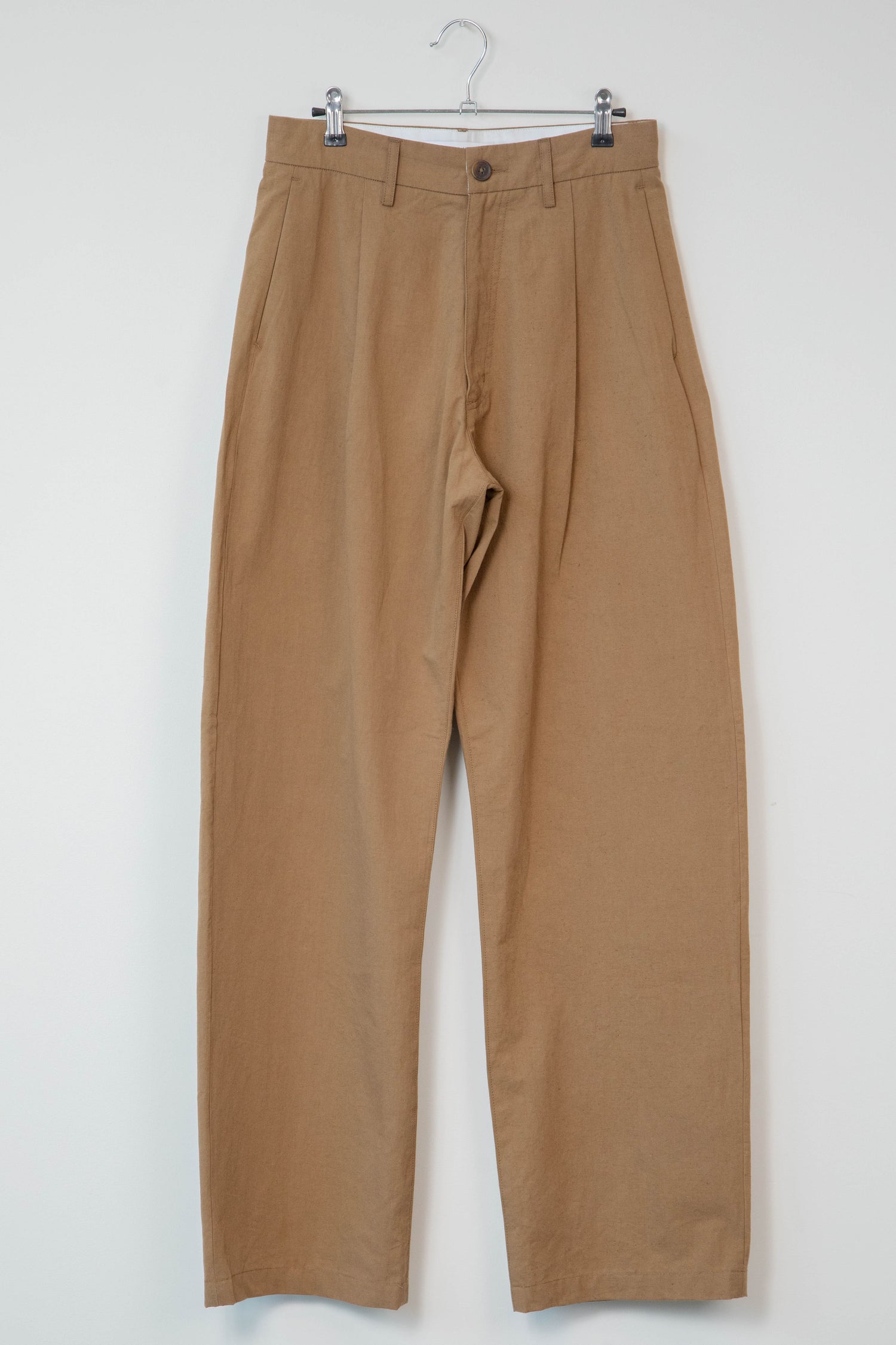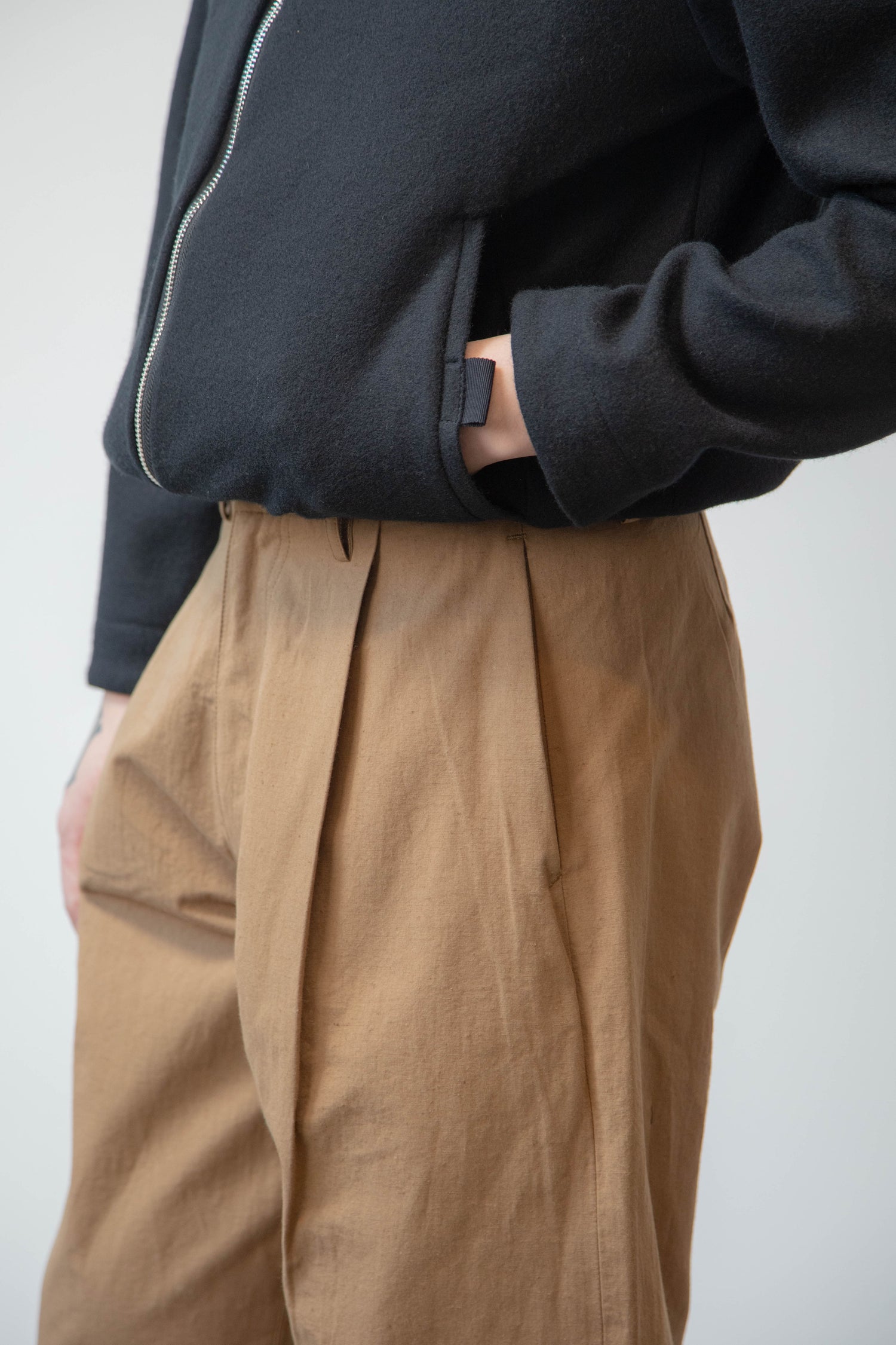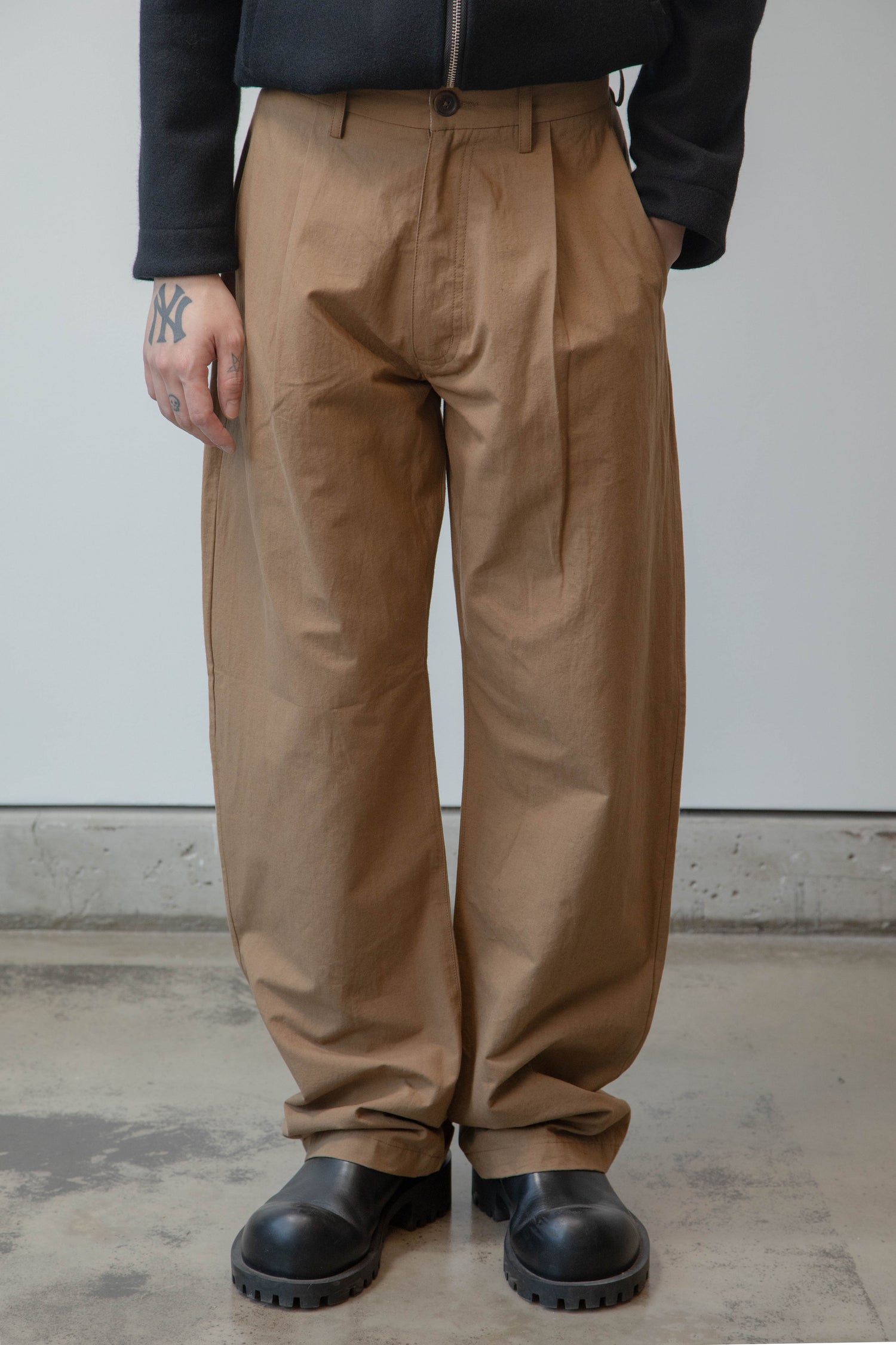 THE CURVE TROUSER IS A TAILORED PANT WITH DEEP PLEATS, SIDE SEAM POCKETS, AND A BACK WELT POCKET. THE PANT CURVES OUT FROM THE HIP GIVING IT VOLUME AND DRAPE.