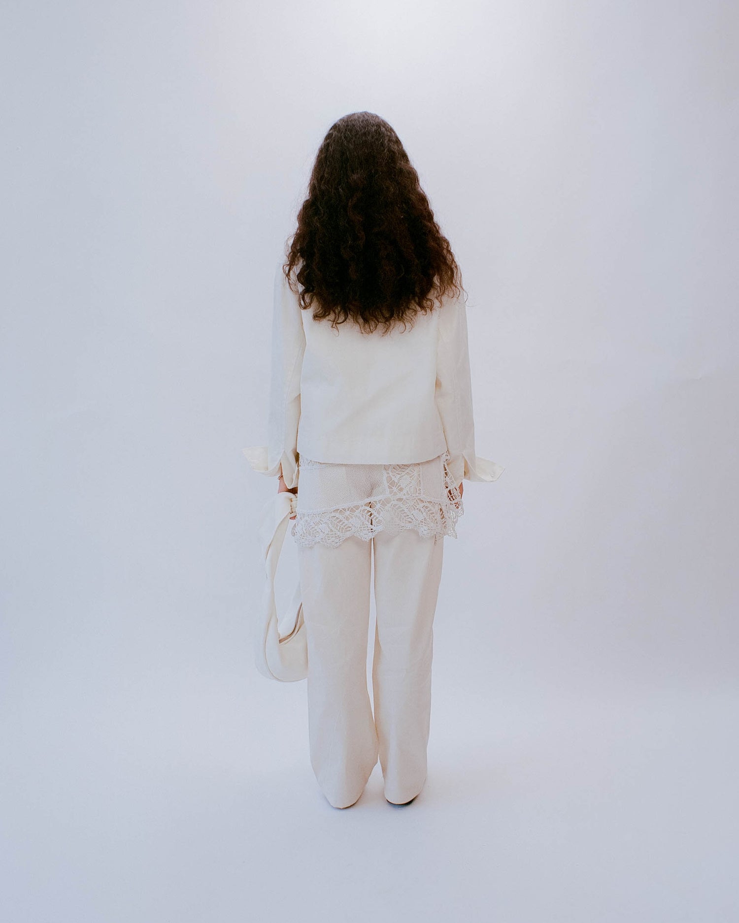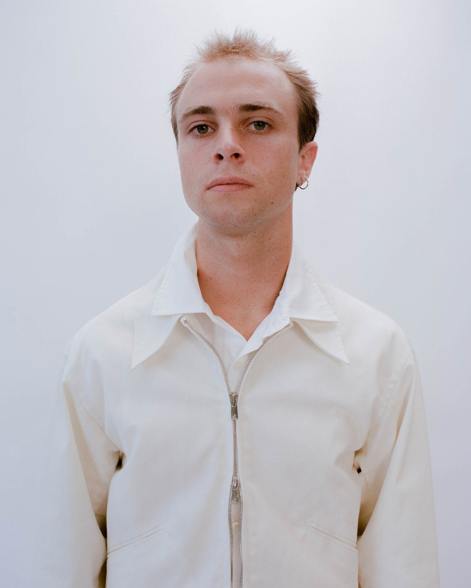 THE BLOUSON JACKET HAS A BOXY, CROPPED, FEATURING A TWO-WAY EXCELLA YKK ZIPPER, TWO WELT POCKETS, AND AN EXTERNAL LOCKER HOOK. THE JACKET IS MADE USING WAXED COTTON CANVAS AND IS FULLY LINED IN 100% COTTON.