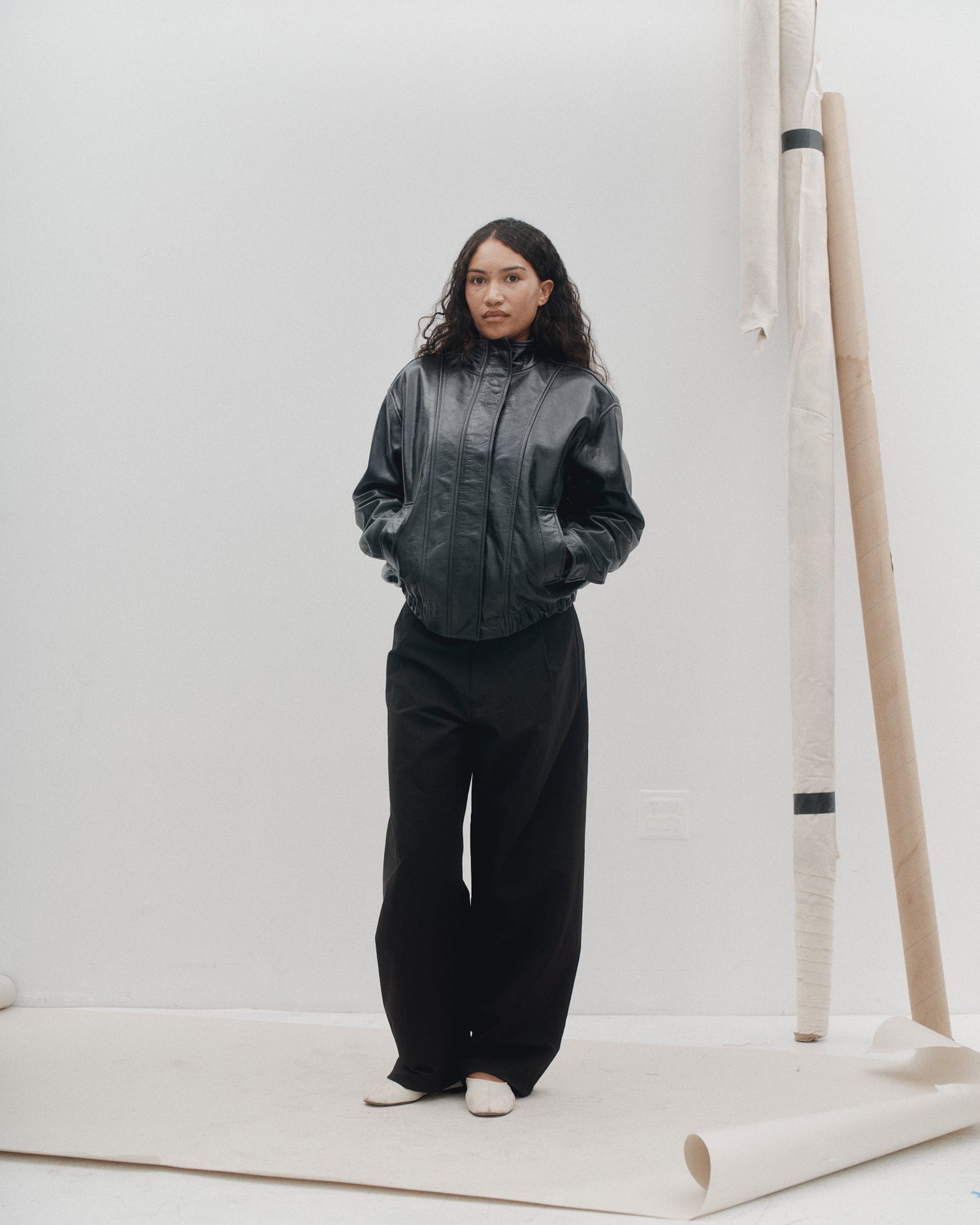 INTRODUCING OUR LEATHER BOMBER. INSPIRED BY VINTAGE SILHOUETTES, THIS FUNNEL NECK JACKET FEATURES A CONCEALED SNAP AND ZIPPER PLACKET, WELT POCKETS, AN ELASTICATED WAISTBAND AND AN INTERIOR POCKET AT THE WEARER'S LEFT.