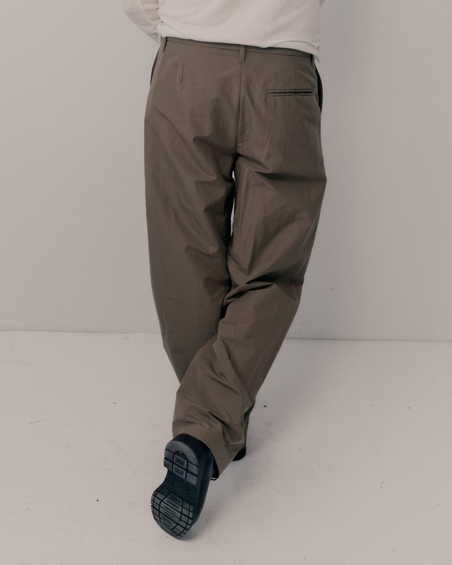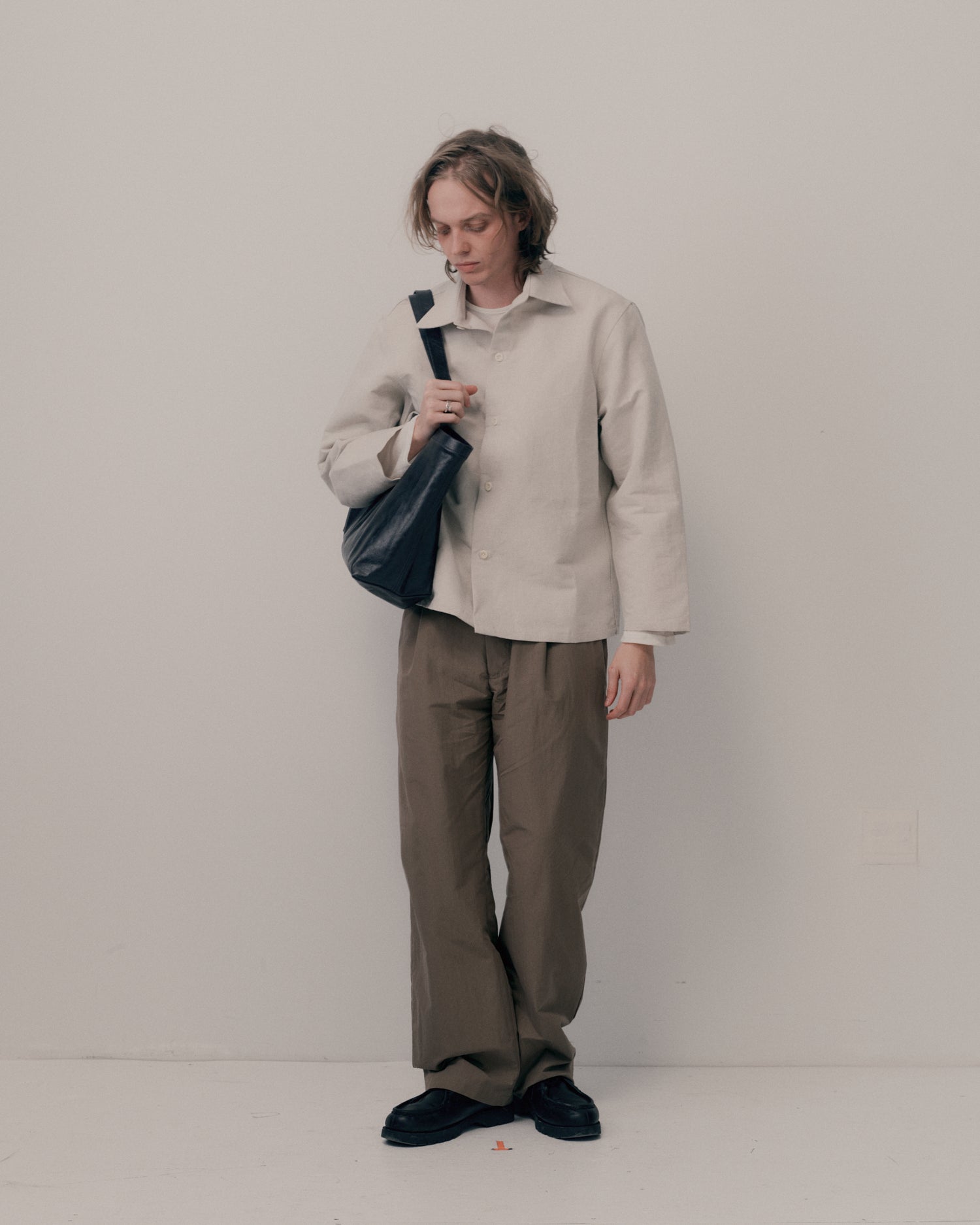 THE CURVE TROUSER IS A TAILORED PANT WITH DEEP PLEATS, SIDE SEAM POCKETS, AND A BACK WELT POCKET. THE PANT CURVES OUT FROM THE HIP GIVING IT VOLUME AND DRAPE.
