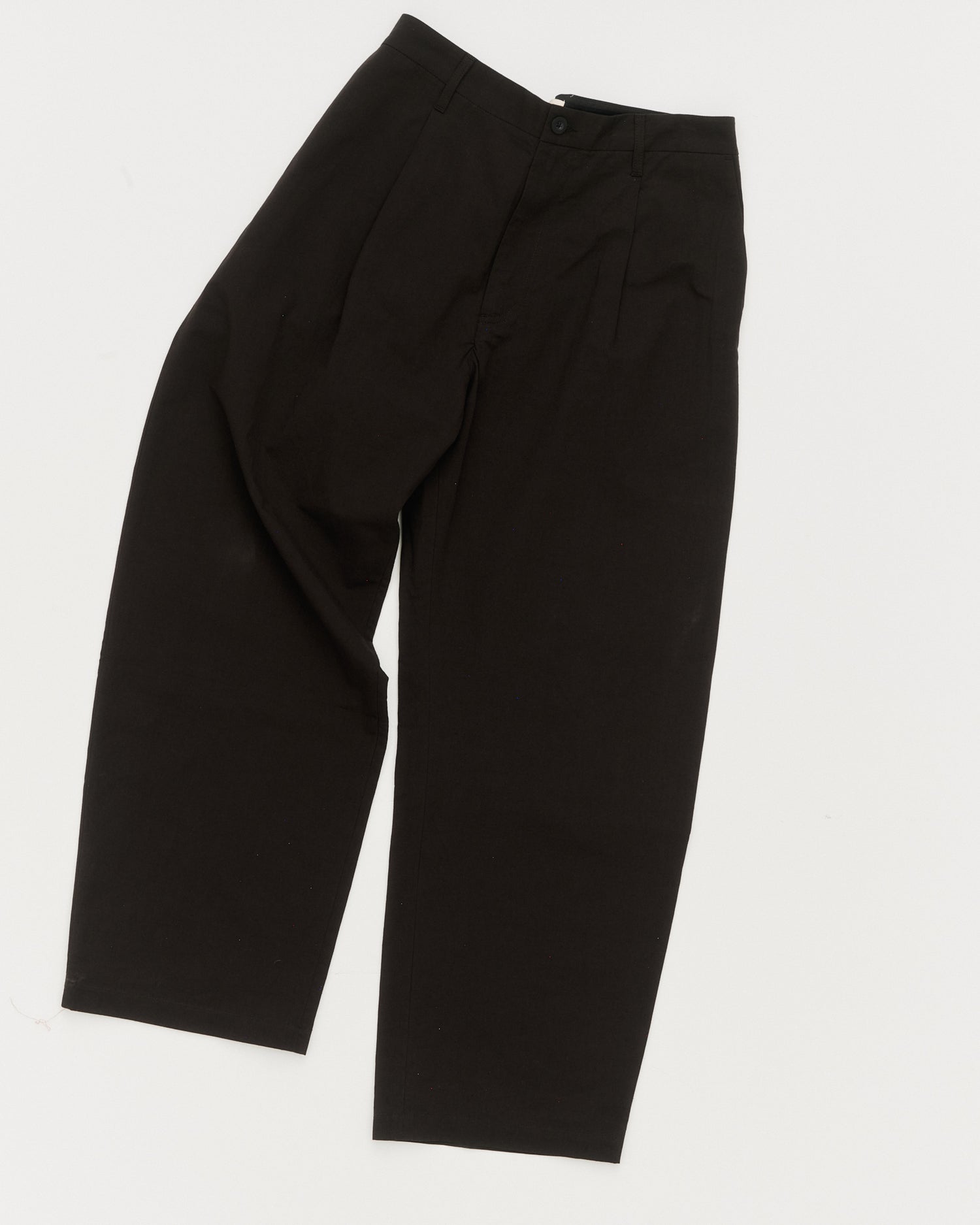 THE CURVE TROUSER IS A TAILORED PANT WITH DEEP PLEATS, SIDE SEAM POCKETS, AND A BACK WELT POCKET. THE PANT CURVES OUT FROM THE HIP GIVING IT VOLUME AND DRAPE.
