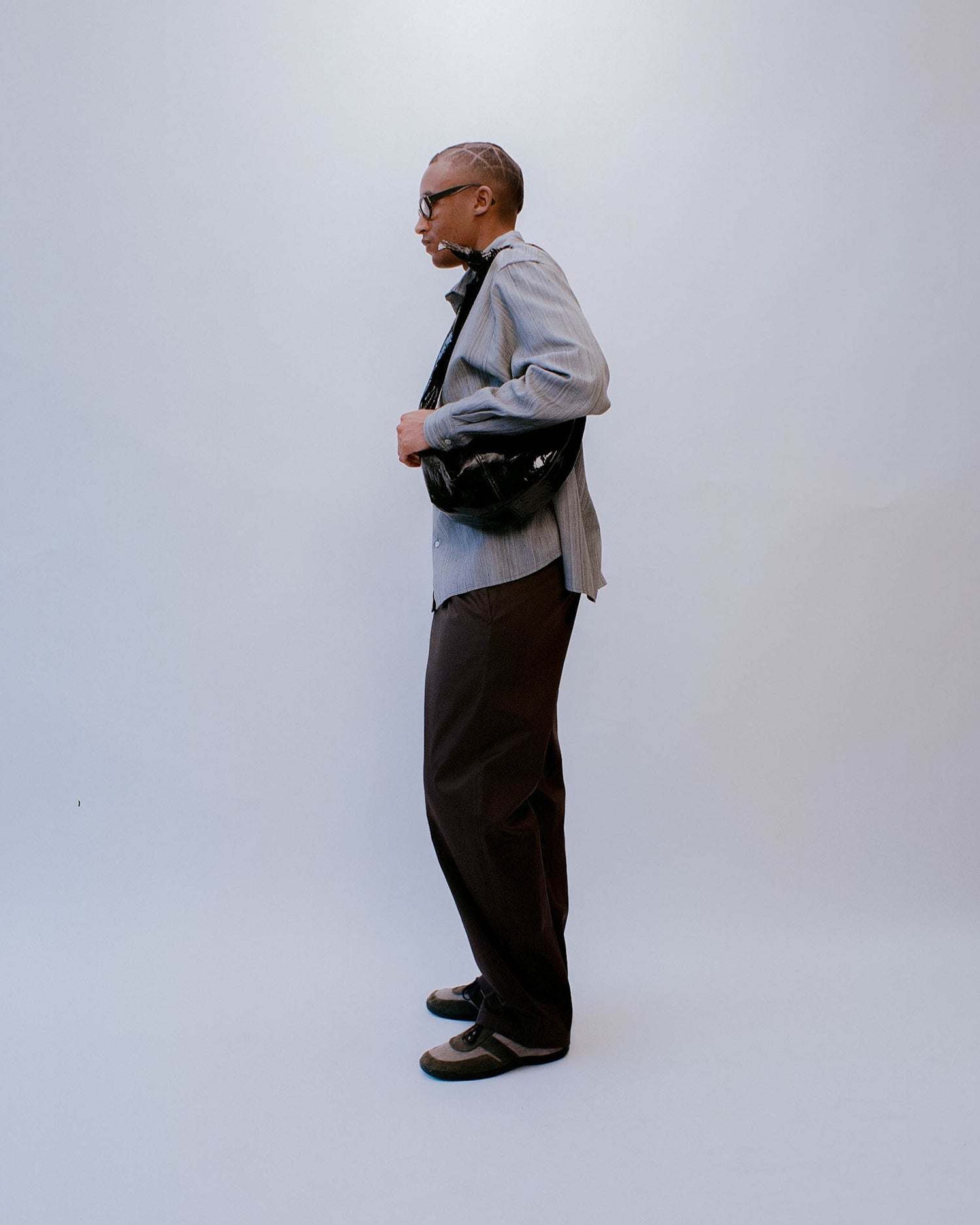 THE CURVE TROUSER IS A TAILORED PANT WITH DEEP PLEATS, SIDE SEAM POCKETS, AND A BACK WELT POCKET. THE PANT CURVES OUT FROM THE HIP GIVING IT VOLUME AND DRAPE.