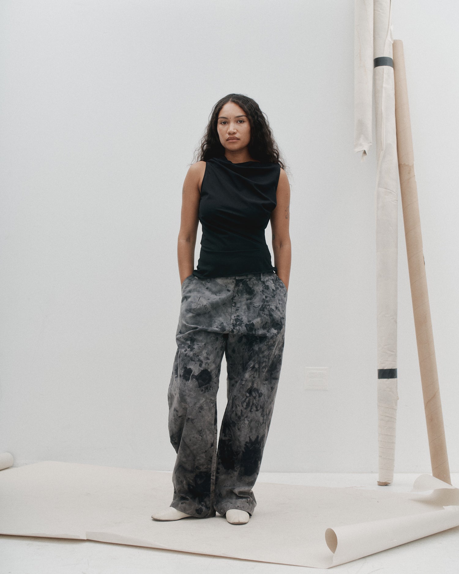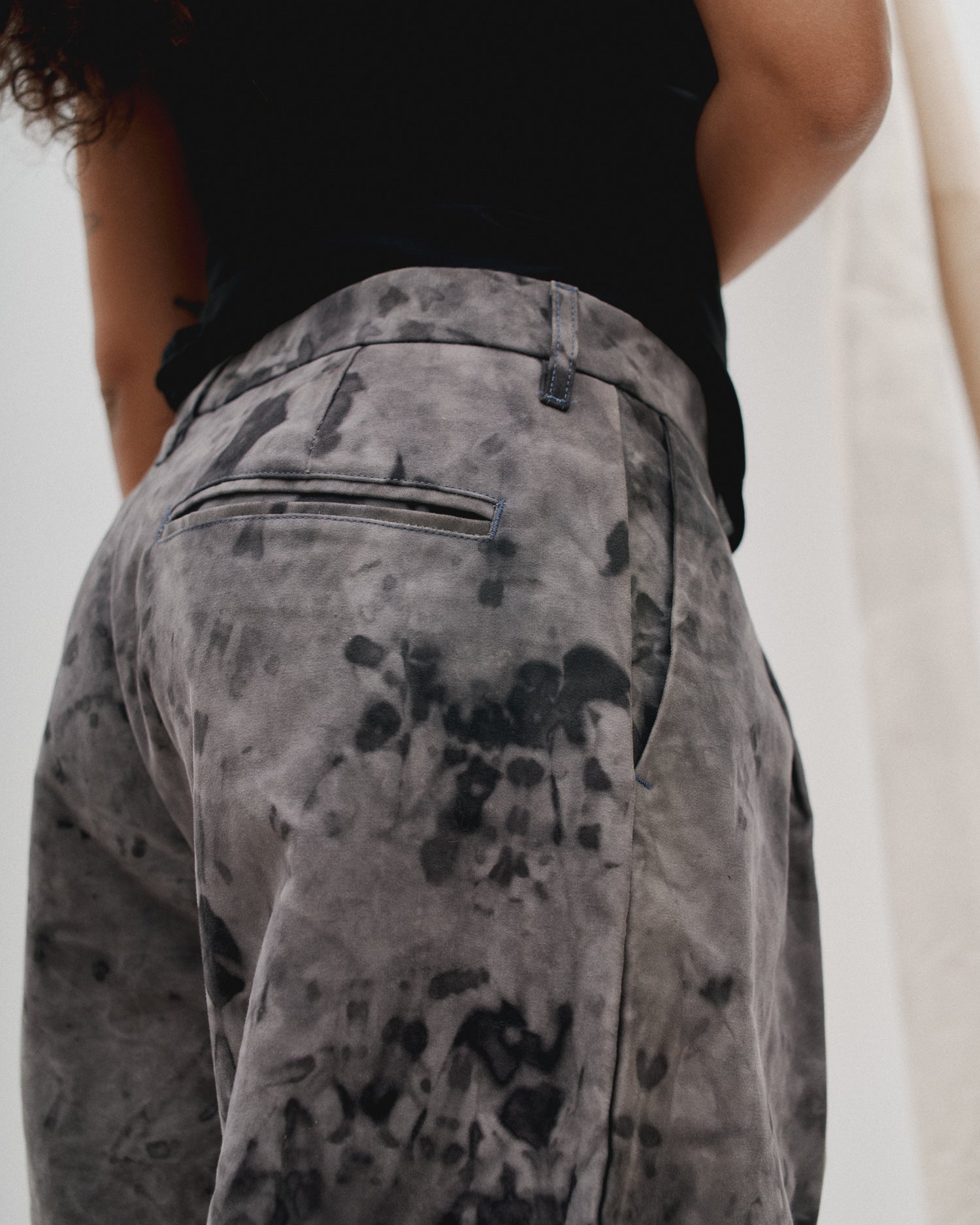 THE CURVE TROUSER IS A TAILORED PANT WITH DEEP PLEATS, SIDE SEAM POCKETS, AND A BACK WELT POCKET. THE PANT CURVES OUT FROM THE HIP GIVING IT VOLUME AND DRAPE.