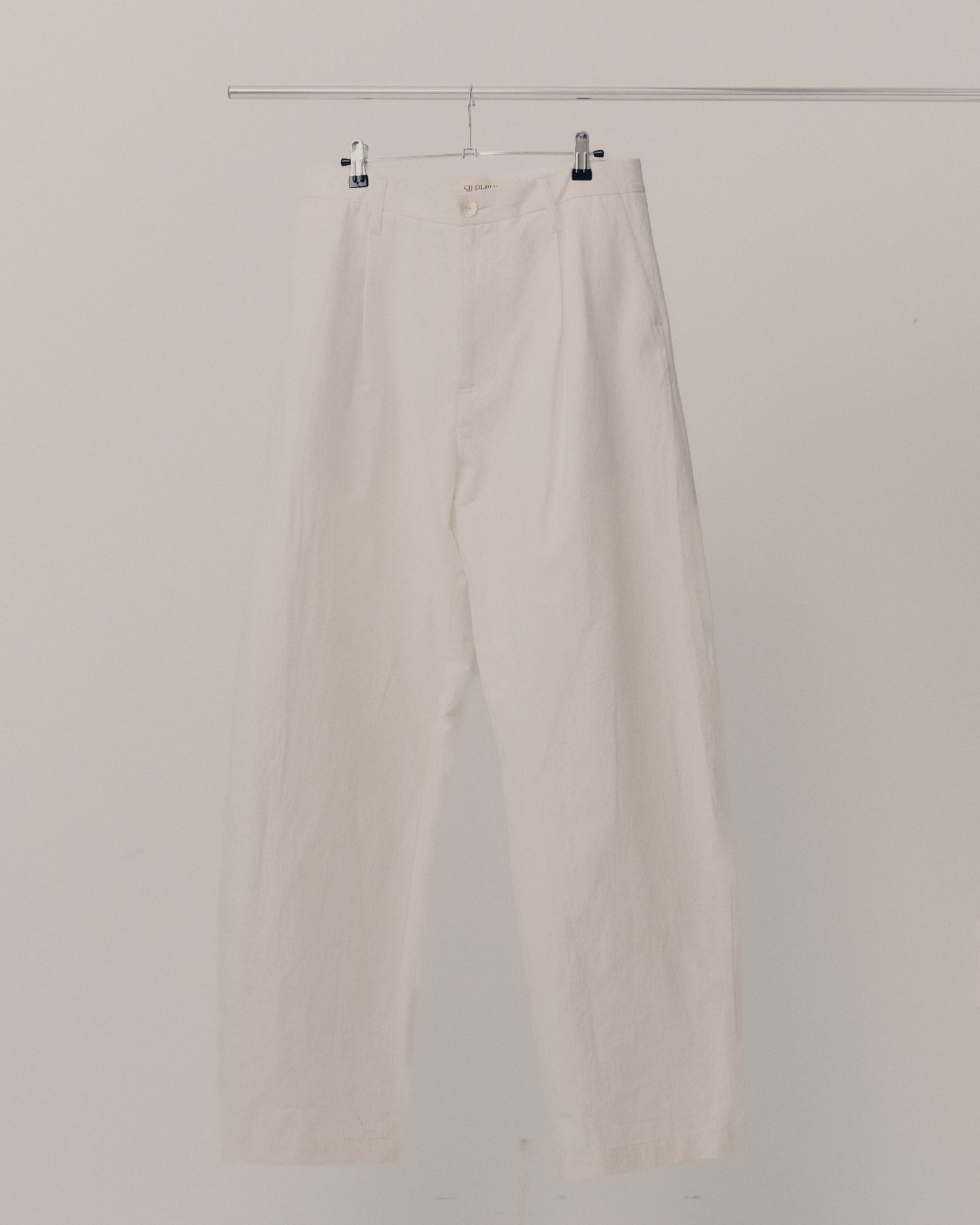 THE CURVE TROUSER IS A TAILORED PANT WITH DEEP PLEATS, SIDE SEAM POCKETS, AND A BACK WELT POCKET. THE PANT CURVES OUT FROM THE HIP GIVING IT VOLUME AND DRAPE.