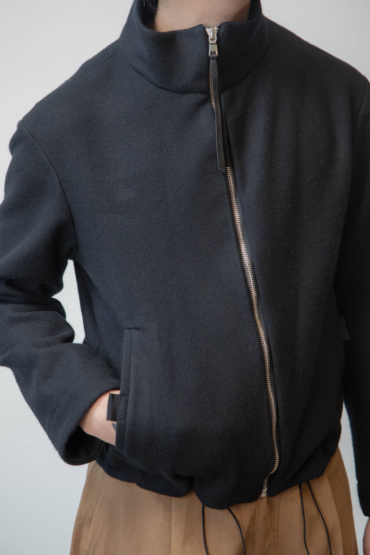 THE ZIP UP JACKET IS A NEW ADDITION TO OUR STANDARDS COLLECTION. MADE IN A DEADSTOCK WOOL MELTON, THE JACKET SERVES AS THE PERFECT LAYER FOR THE FALL. THE JACKET FEATURES BIAS BINDING, WELT POCKETS, ZIPPER CLOSURE, AND ADJUSTABLE CORDING AT HEM.